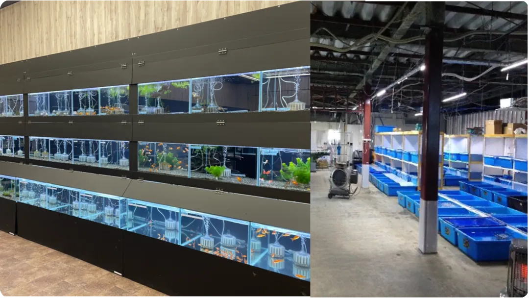自社で観賞魚を在庫・管理し、常にコンディションの整った生体を安定供給。店舗水槽の設計・製造・設置・メンテナンスまで一括対応し、“売れる・維持できる”生体売場をトータルで構築します。単なる什器提供ではなく、売場として機能する仕組みそのものを提供しています。