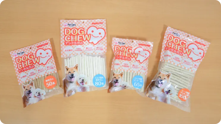 種類は骨型と棒型、マンチー棒型の3種類。そして愛犬に嬉しいミルク風味もご用意。
