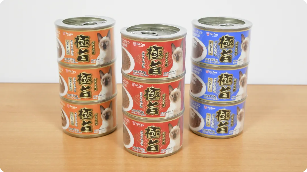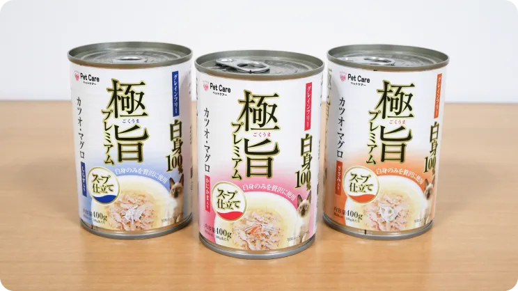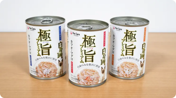 風味豊かなかつおとまぐろの血合い肉を使用し、素材本来のおいしさをそのままいかすために、余計な味付けをせず、水煮でシンプルに仕上げました。魚の旨みがしっかり感じられる血合い肉を使用しているので、愛猫が好む風味で食欲をそそります。