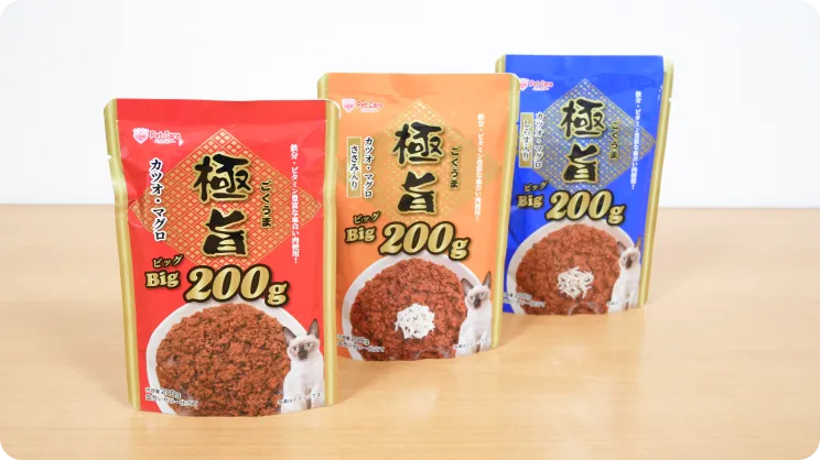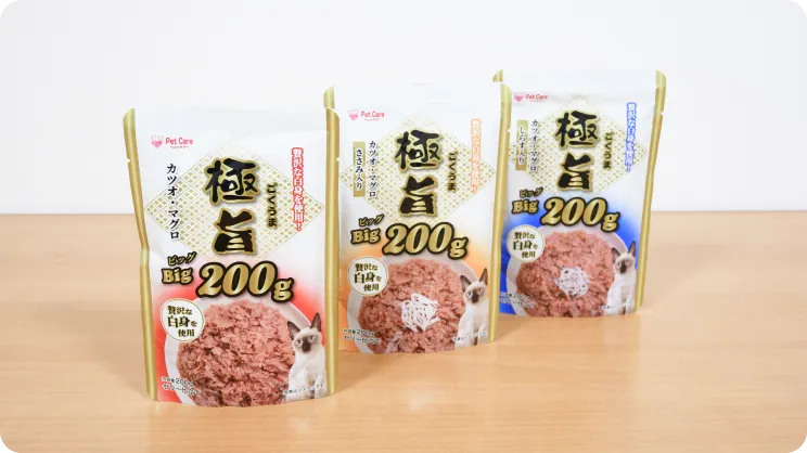 大容量の極旨200gパウチは、栄養豊富なかつおとまぐろの血合い肉、または贅沢な白身肉をミックスし、愛猫の食欲をそそるこだわりのごはんです。多頭飼いの飼い主さんや、いっぱい食べる愛猫にも嬉しいたっぷりサイズ。また大容量だけどパウチだから簡単に捨てられるので飼い主さんも嬉しい。