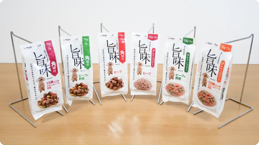 またしっかりとした噛み応えで食感を豊かにする角切りタイプ。どちらも愛犬の満足感を高めます。毎日のごはんにバリエーションを広げ、愛犬の健康と食のよろこびを育みます。