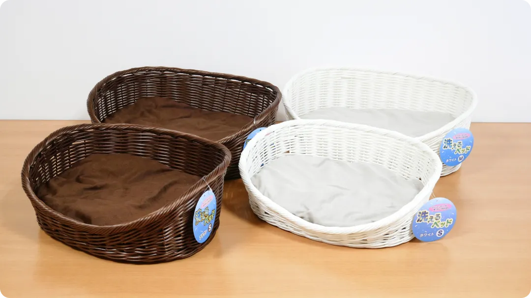 プラスティック製の紐を編み込んだカゴ型でオールシーズン快適です。中のマットは取り外して洗えるのでいつも清潔さを保てます。またお部屋に馴染む、ナチュラルで美しいデザインです。洗えるベッドで囲まれた空間は、愛犬愛猫が心ゆくまでくつろぎ安らげる特別な場所を提供します。