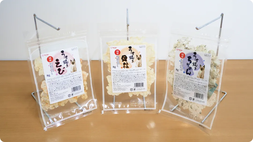 素材本来の風味を大切にし、ちりめん、えび、貝柱をそのまま特殊製法にて薄くしました。やわらかくちぎりやすいので、愛猫の大きさに合わせて与えられます。